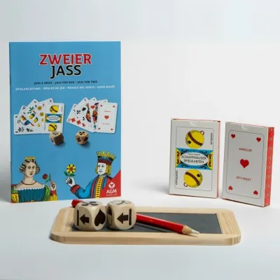 Bestellen Sie jetzt Ihr Jass-Set, Jass-Box, Jass-Etui oder Jass-Garnitur! Unsere Sets enthalten alles, was Sie für eine Jassrunde brauchen: hochwertige Jasskarten, eine stabile Tafel, Kreidestift und Schwamm. Perfekt für unterwegs oder einen gemütliche Spieleabende.
